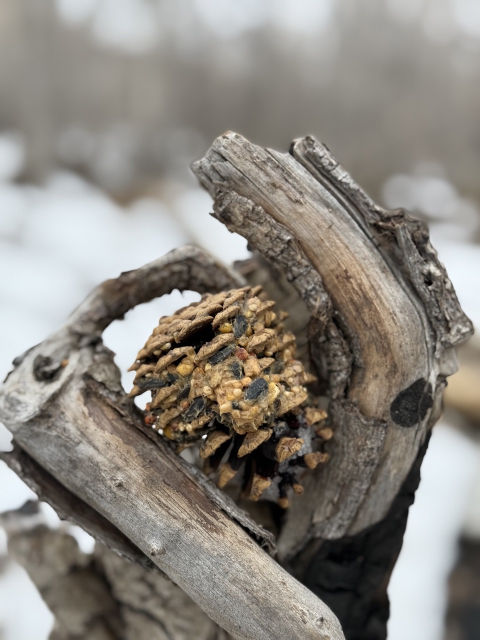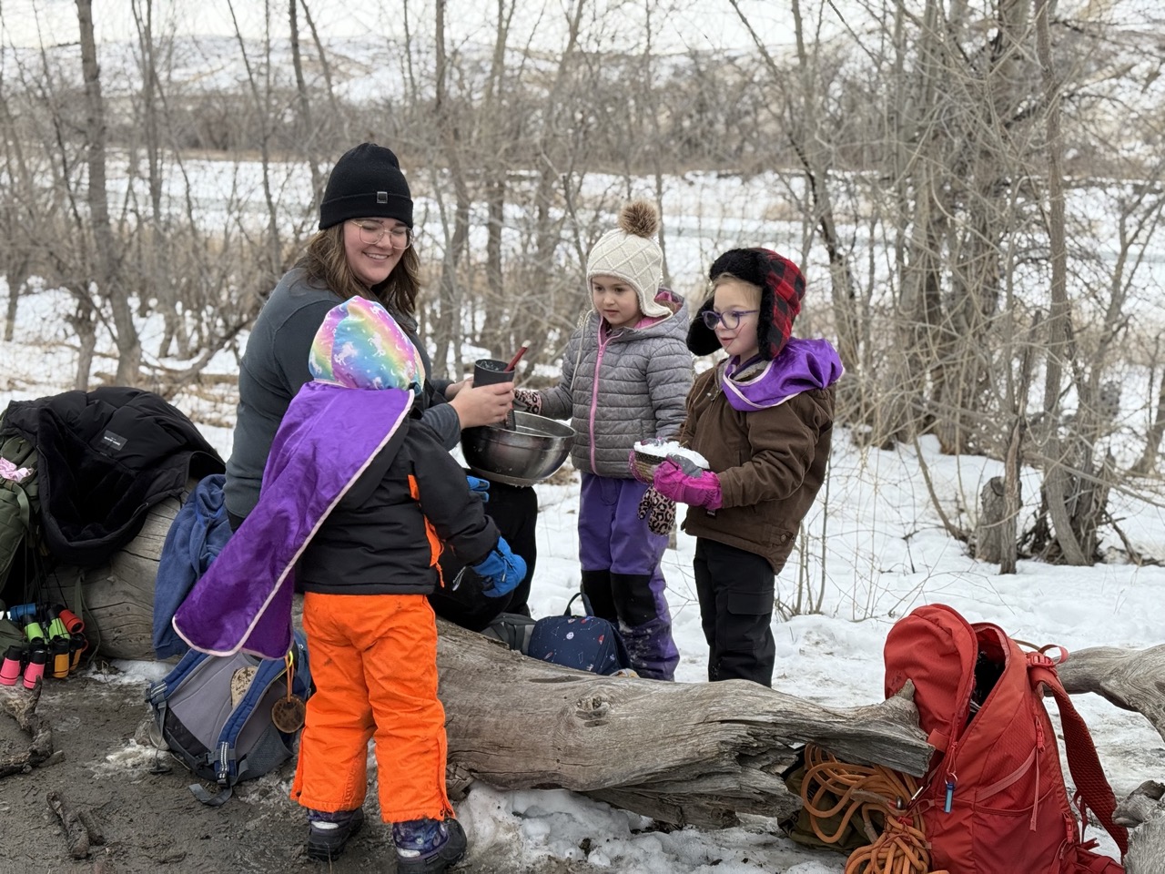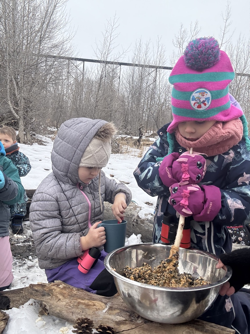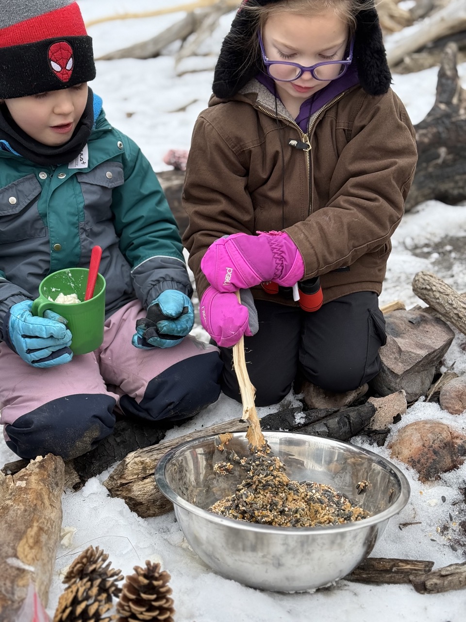 We wrapped up the day by making snow ice cream, listening to Nikayla share a story about chickadees and evergreens in winter, and creating pinecone bird feeders to help the birds through the rest of the season. 😊