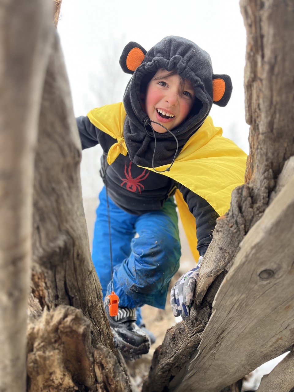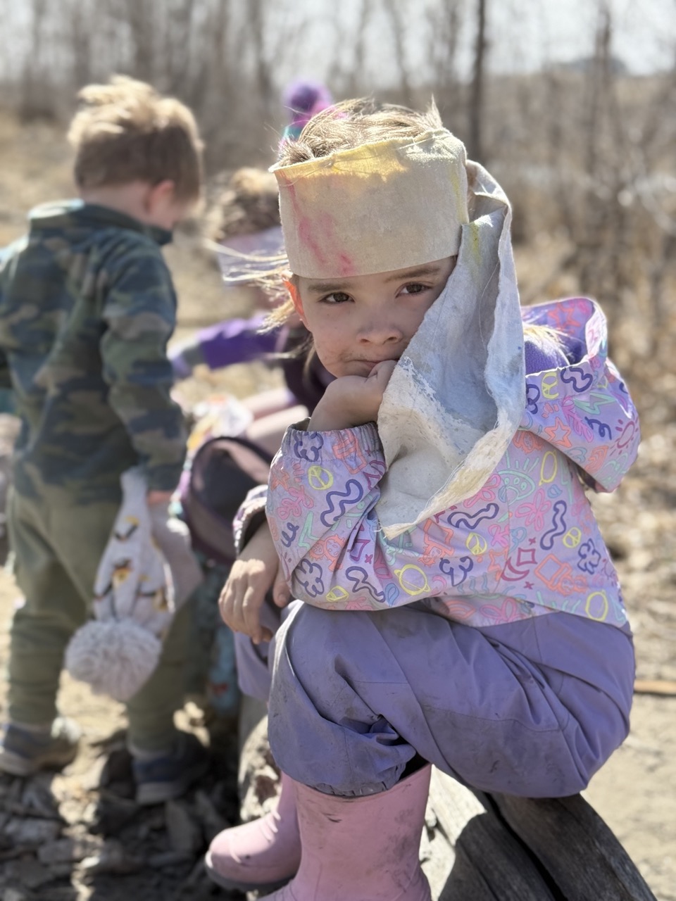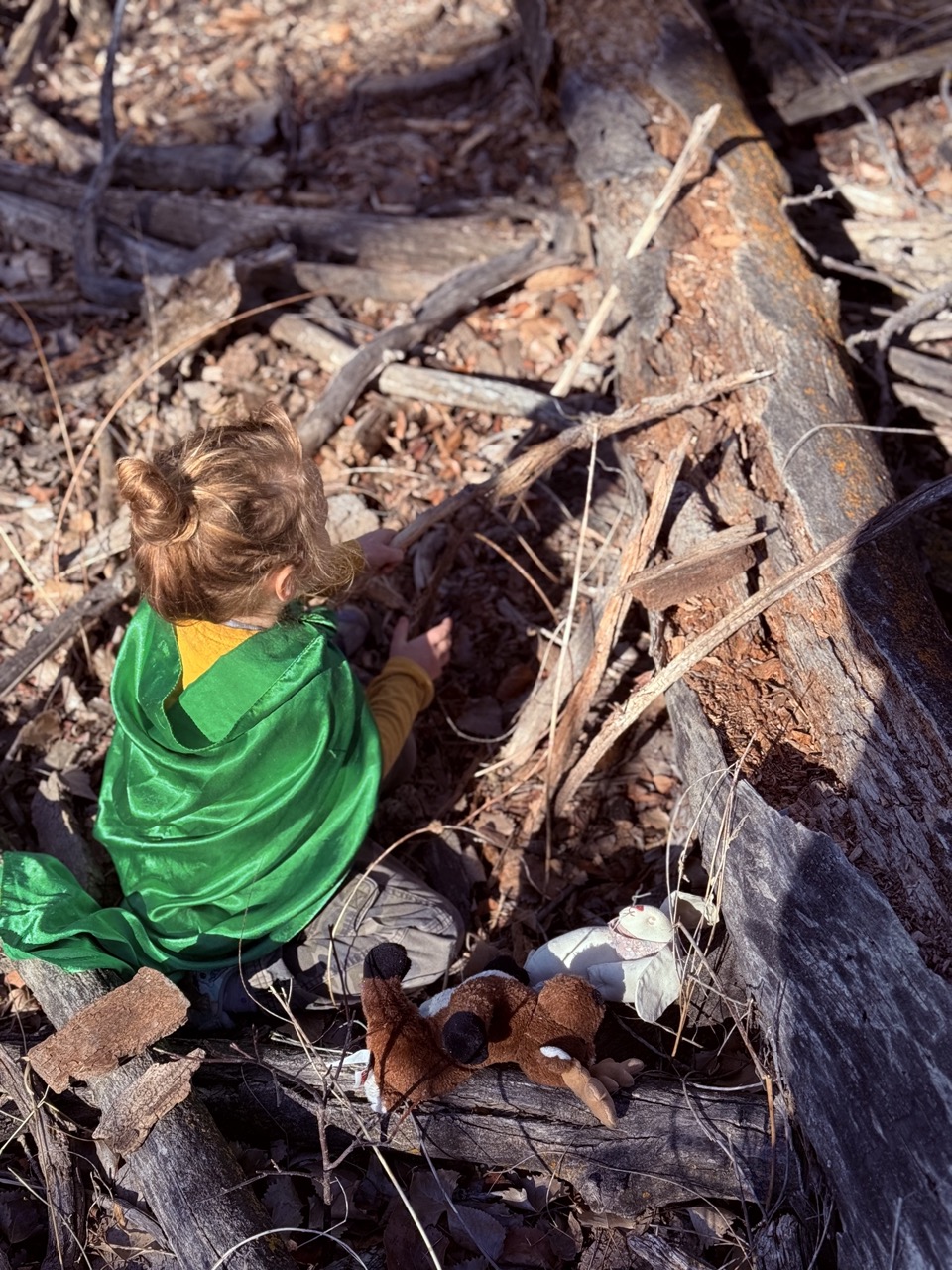 I spoke about this very day at a conference the following weekend, sharing how children engaged in self-directed play are biologically designed to educate themselves through play. At one moment, a couple of girls were snacking while trying to figure out why the moon was in the sky in the middle of the day. Meanwhile, some kids were problem-solving, discussing, and delegating as they worked together to build dens and a playground for their forest friends. Others, wearing capes, were immersed in fantasy play—the highest form of cognitive thinking children engage in! A few more were testing their physical limits and assessing risk as they balanced on a log at different speeds.
