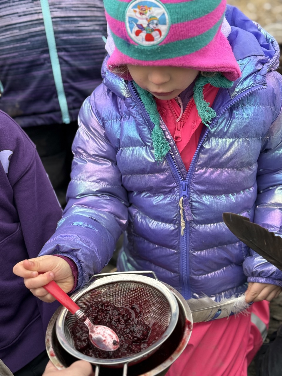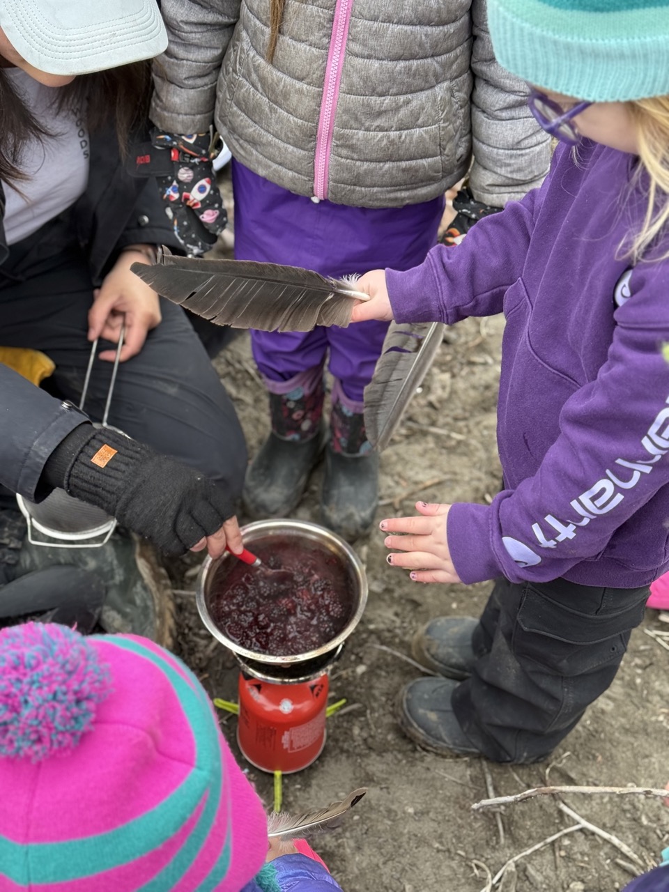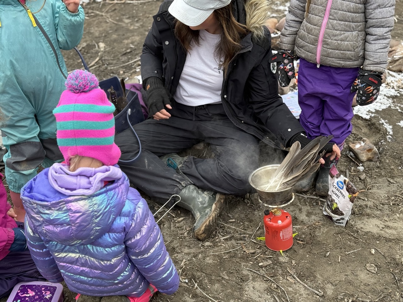 Looking for wild edibles in winter isn’t always easy, but these kids were determined! We ended up making a foraged tea using mullein, grass, cambium, wormwood, and spruce.