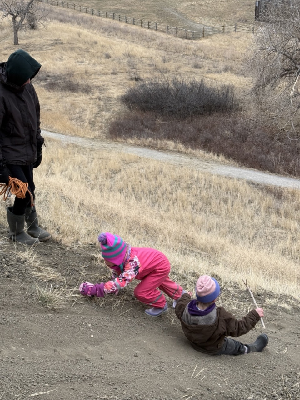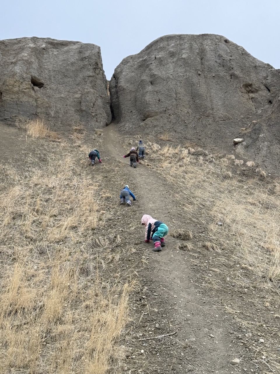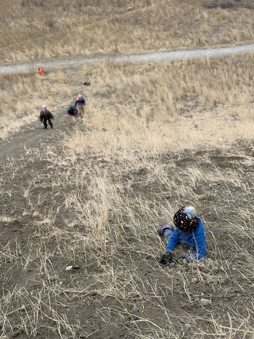 To stay warm, we kept moving all the way to the big hill! There, these wildlings worked their bodies hard—climbing up high, sliding down, and repeating the cycle again and again.