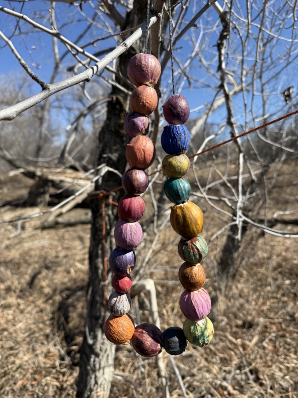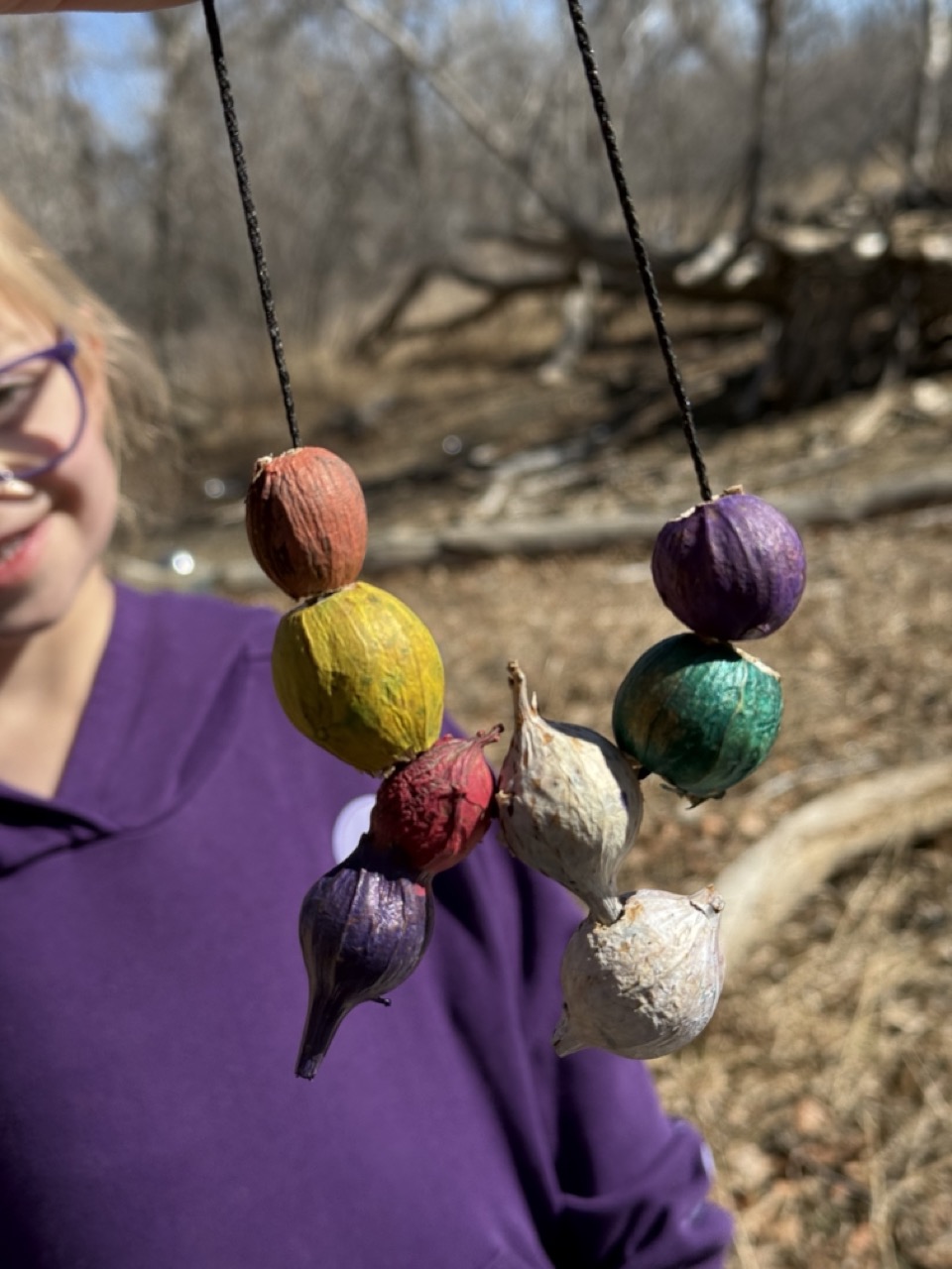 We picked galls from goldenrod plants and wildcrafted them into necklaces! These little wonders are actually homes made from the saliva of a tiny fly—nature is wild!