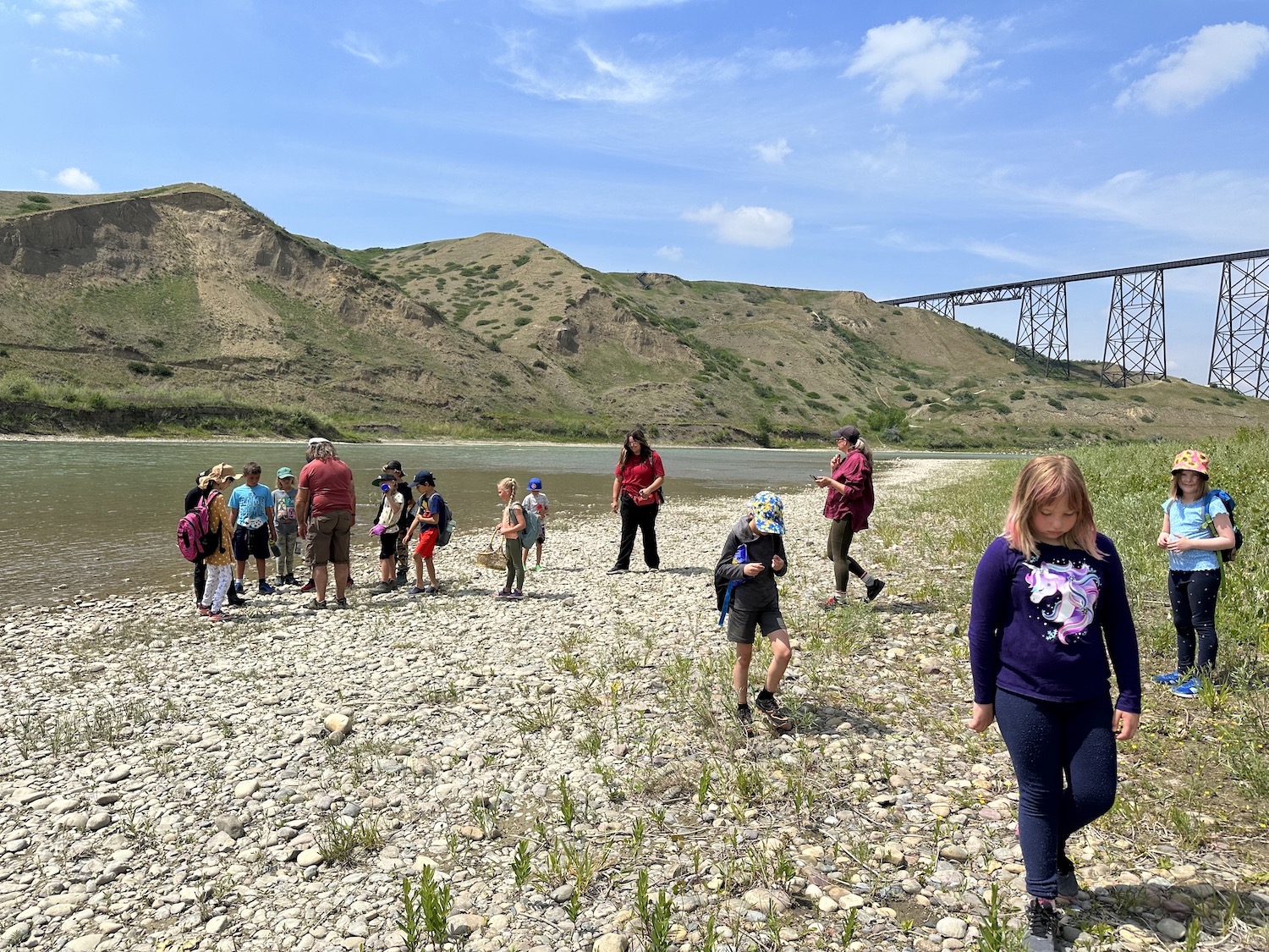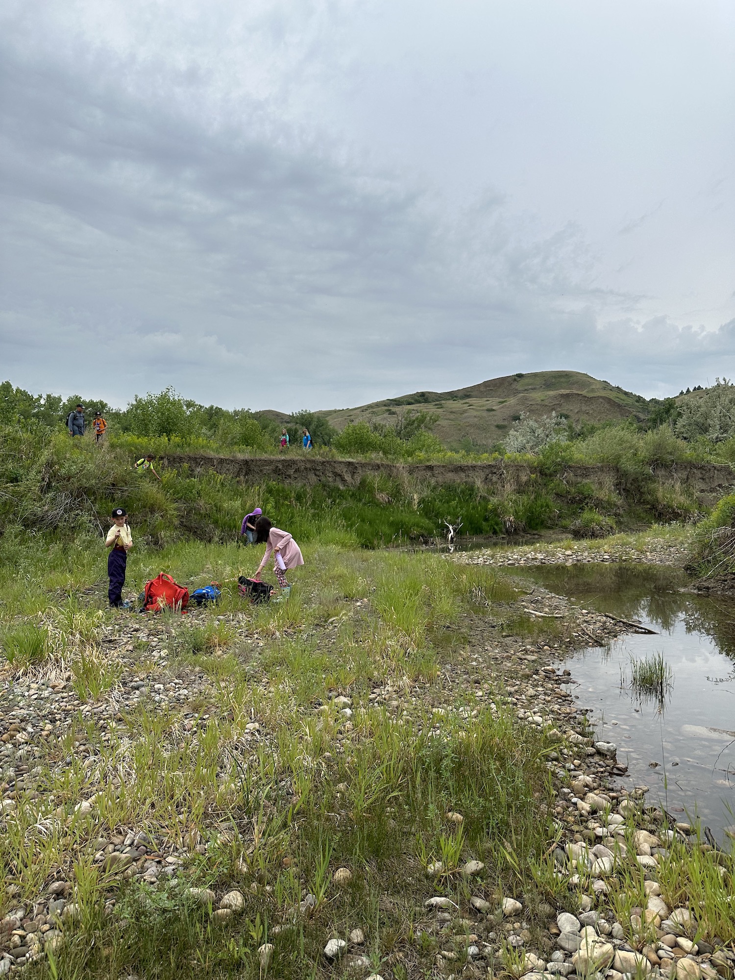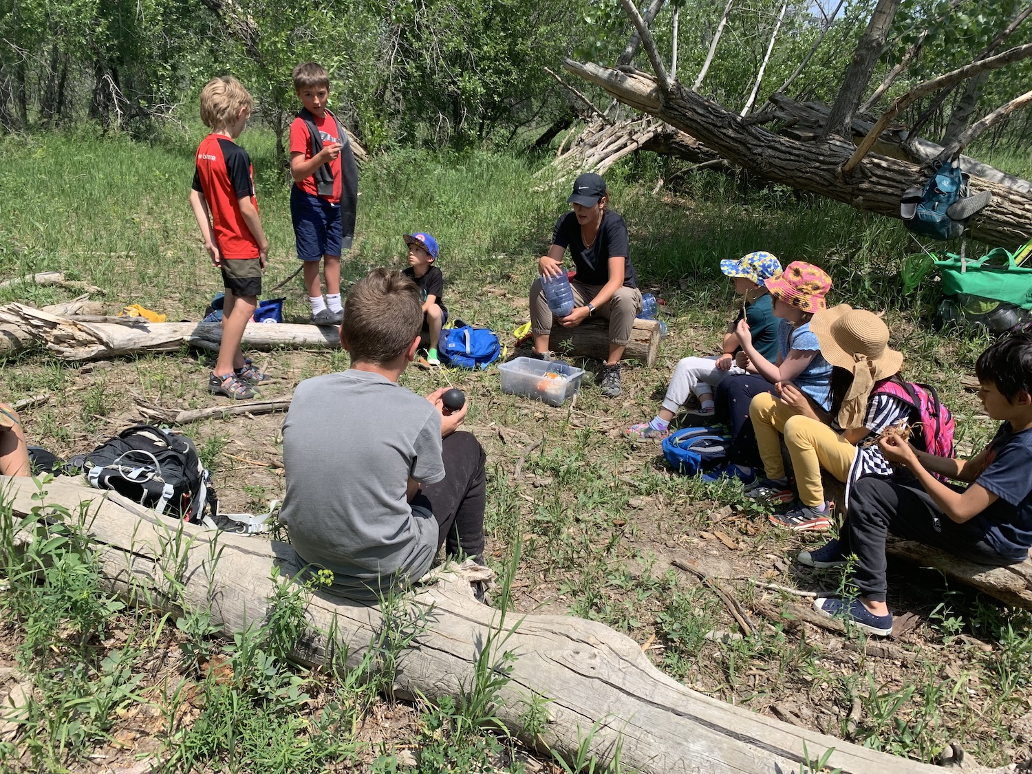 It was a building resilience kind of day, as we fought through some discomfort on our hike, but the destination was well worth it! We went to our favourite place in all of the coulees, where tad poles, minnows, frogs, and beaver dams reside. These wildlings observed tadpoles up close wondering how they turned into the frogs at the other end of the pond. We saw our normal forest school site from a whole new perspective up high on the bridge, and noticed different plants that grew on the other side of the river.