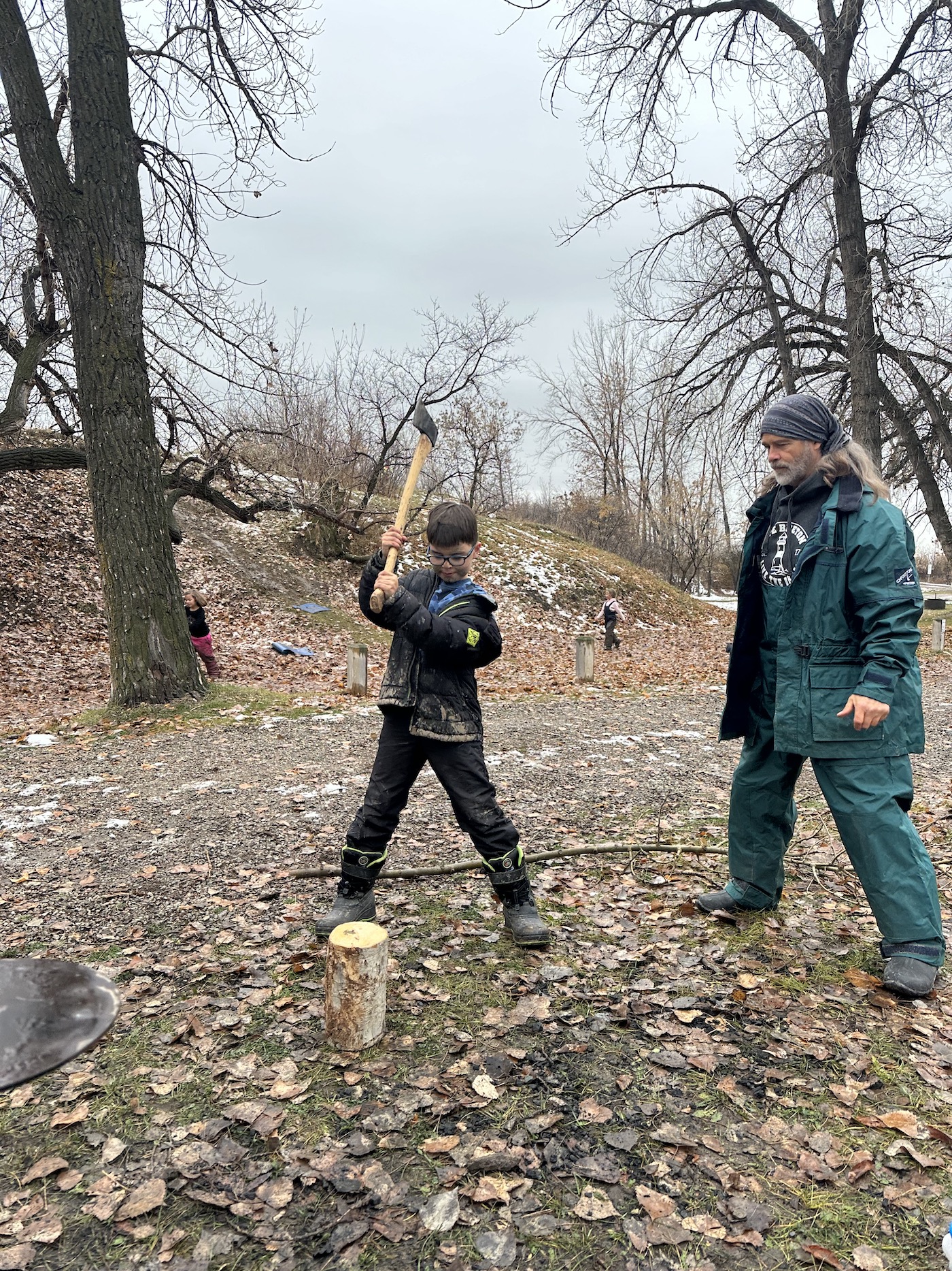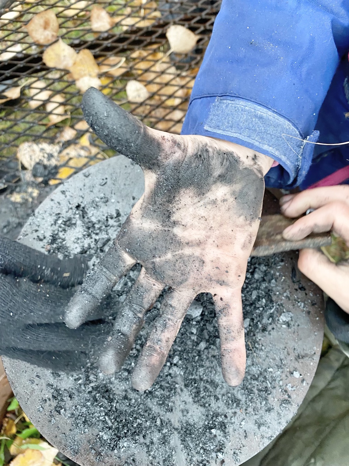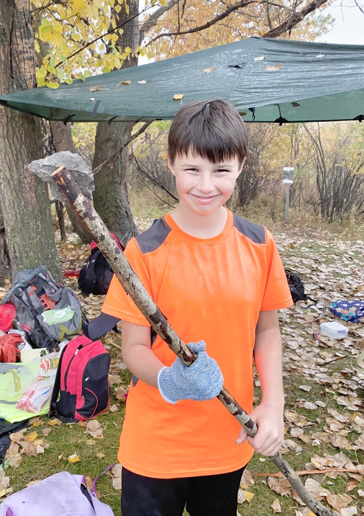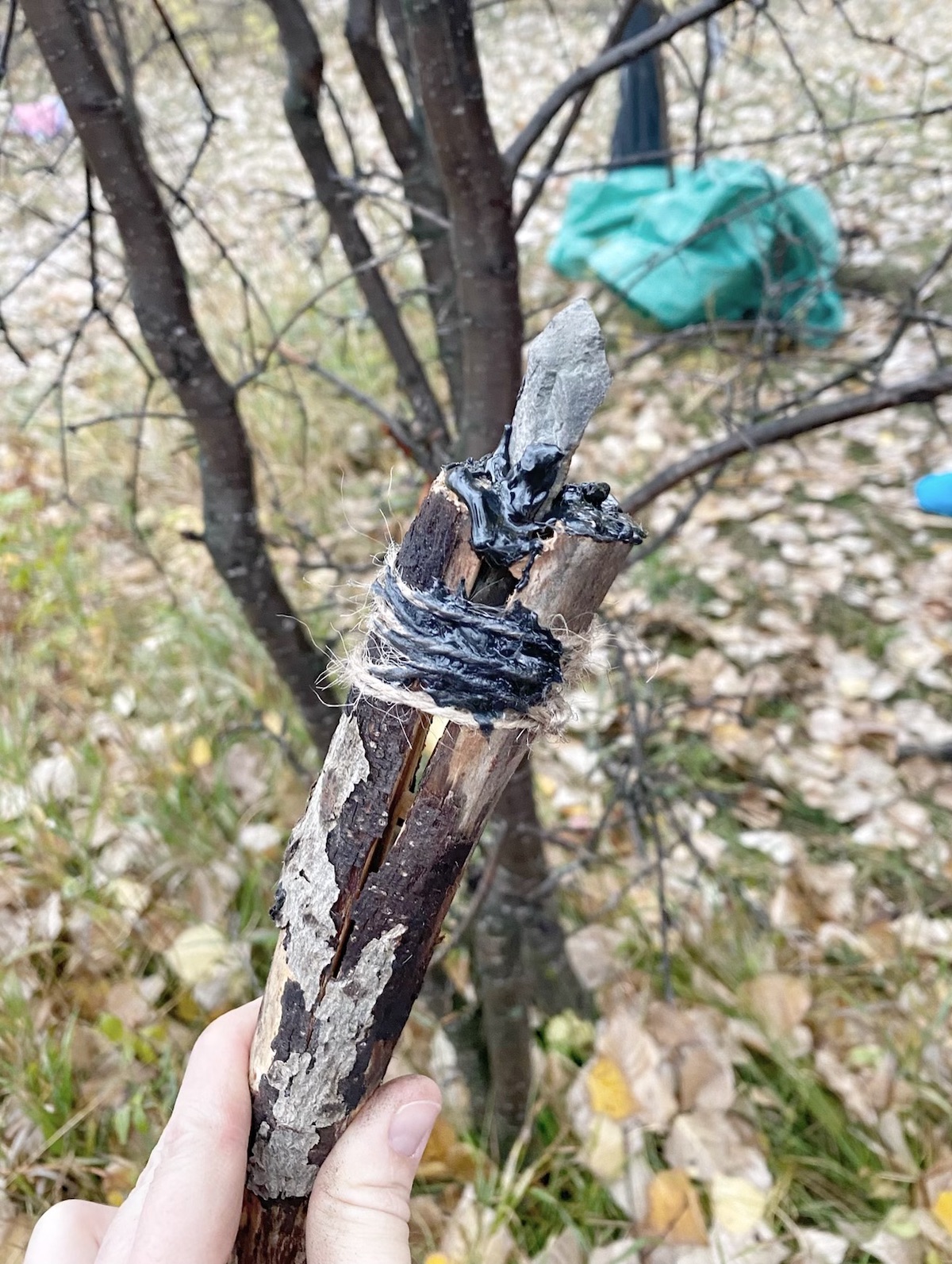 What an awesome day to learn a new wilderness skill and become a little more resilient in the cold and rain. We set off to find the perfect stick, collect sap and crush charcoal to make natural adhesive and spears. These kids will never look at sap the same way!