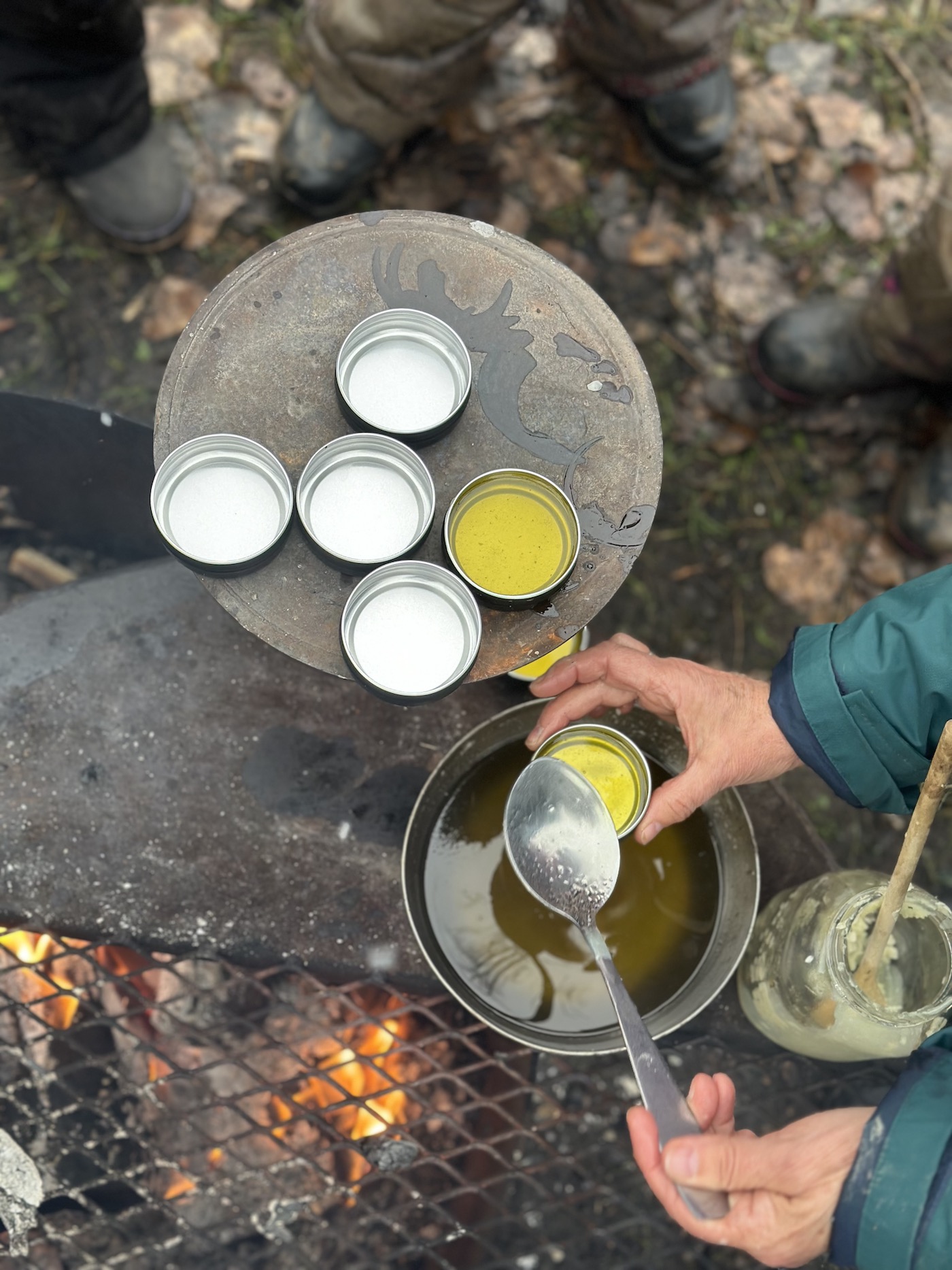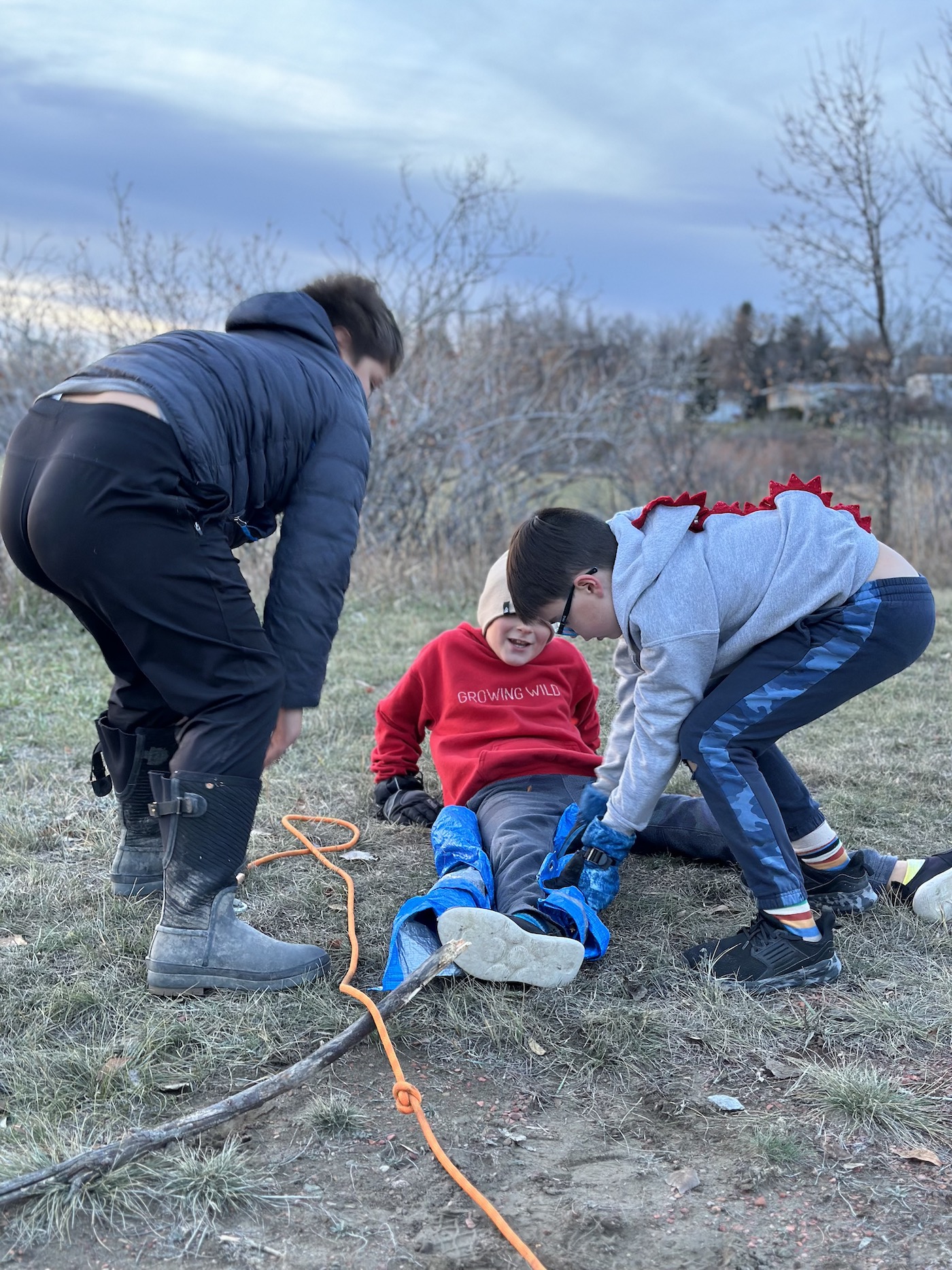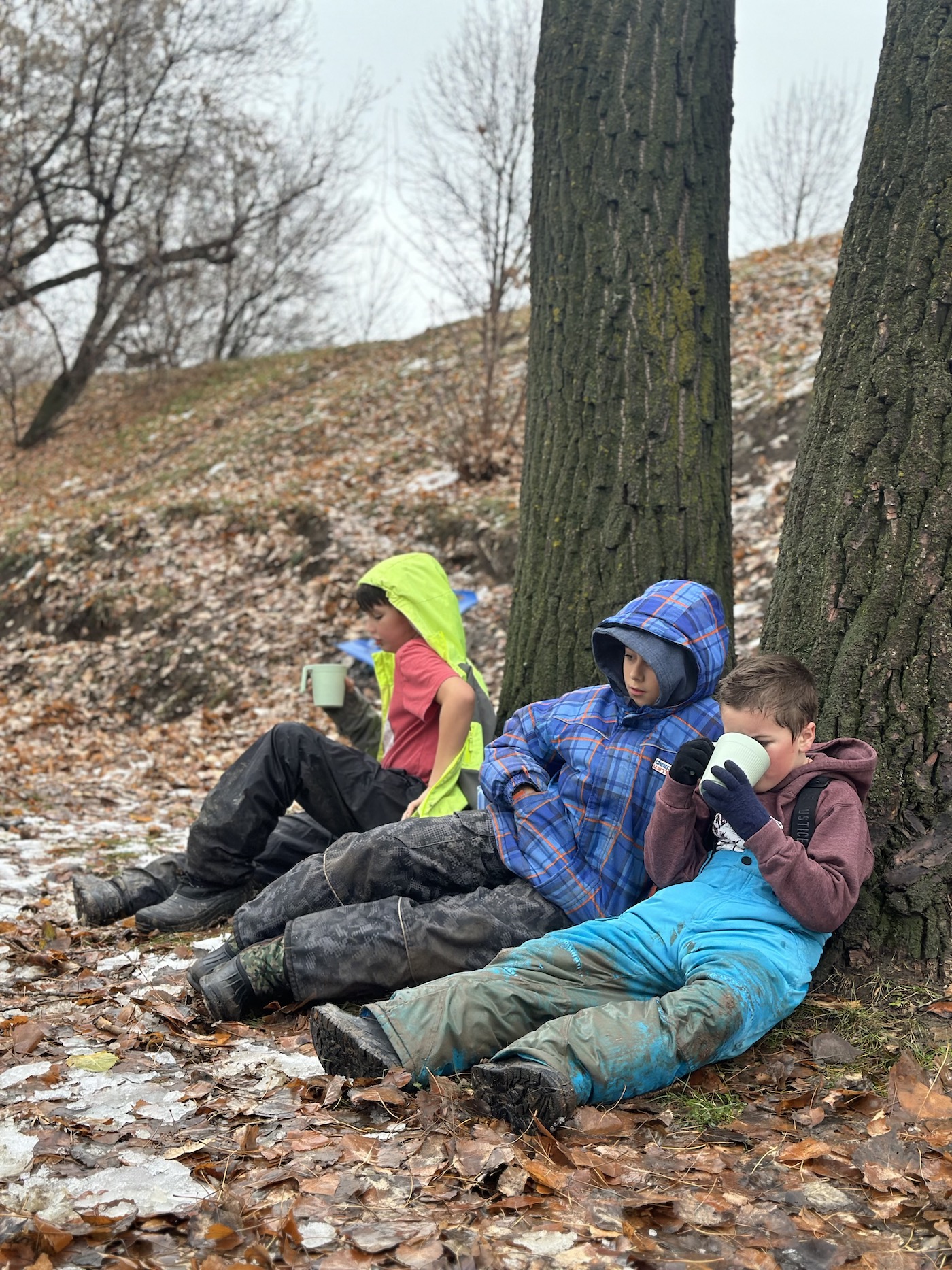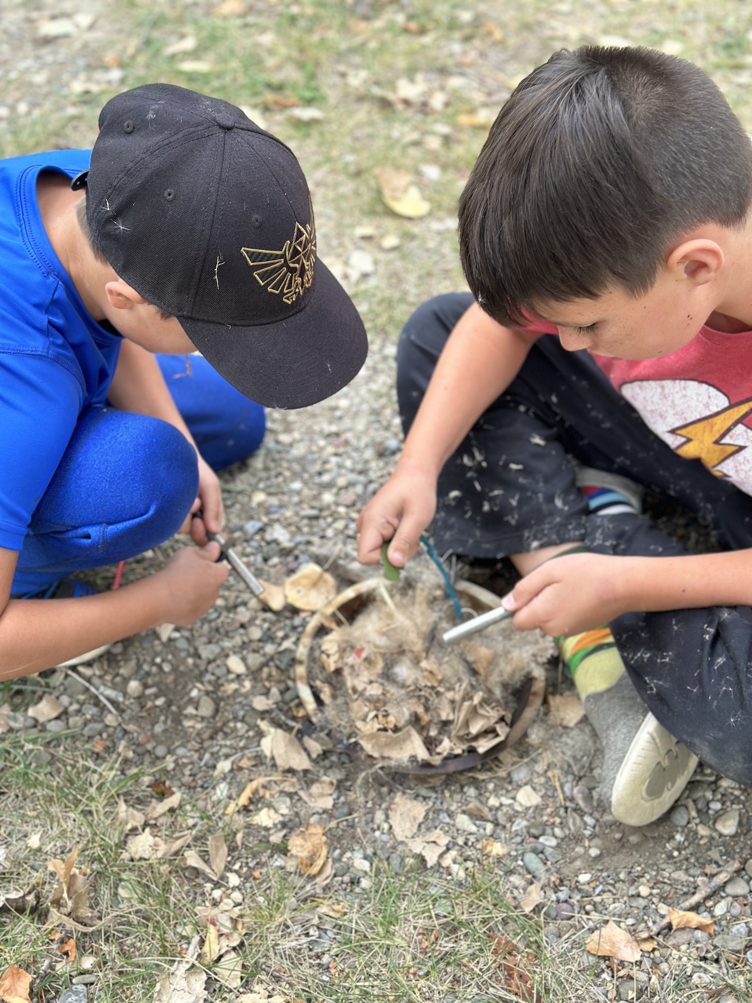 What an awesome day to learn a new wilderness skill and become a little more resilient in the cold and rain. We set off to find the perfect stick, collect sap and crush charcoal to make natural adhesive and spears. These kids will never look at sap the same way!