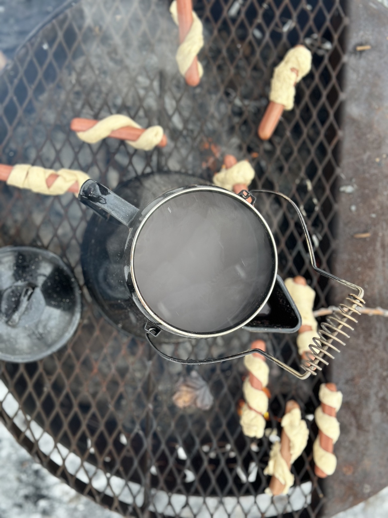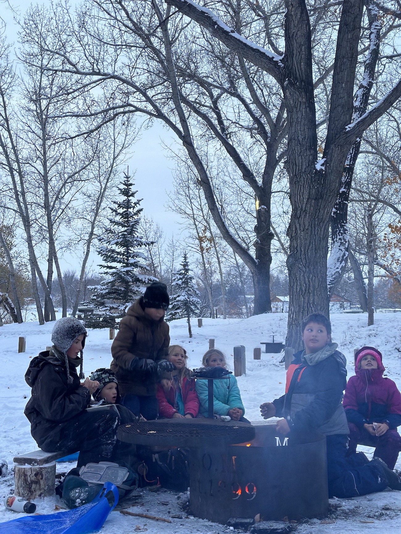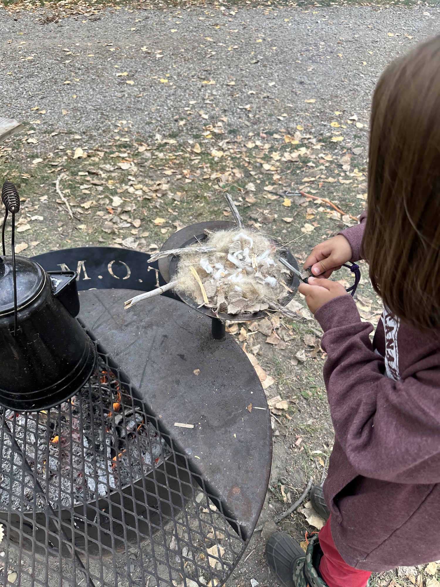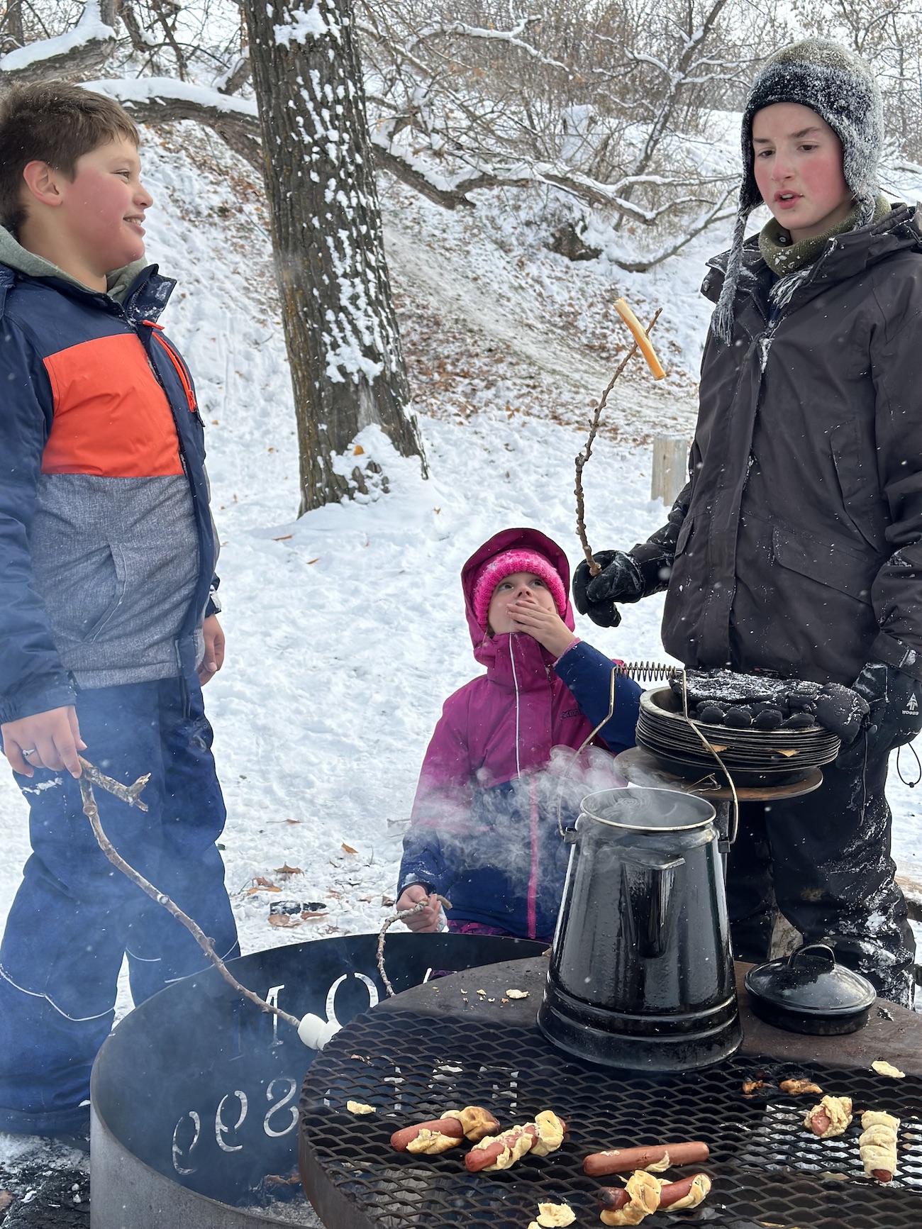 We took on the hard task of learning how to forage for fire starting supplies, in lots of snow! No better time to teach fire starting than in terrible fire weather! Collecting dried roots, and fat wood we truly hit natures gold! After coming back to start fires we roasted Oreo s’mores, hotdogs and enjoyed hot coco!