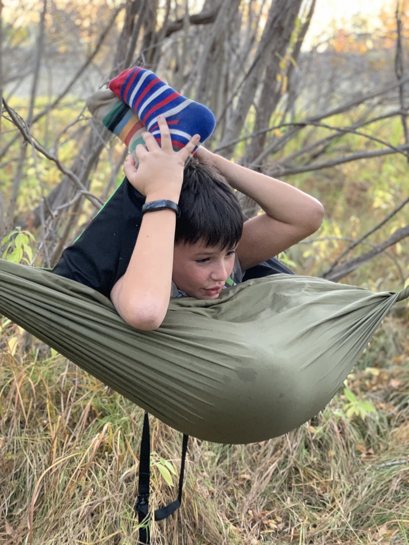 We set off to forage for apples and fire starting materials. With all these wildlings having used ferro rods, they set right to work getting their own and our group fire roaring. These wildlings cut up many apples adding them to our wild apple cider. Feeding the fire and checking the apple cider along the way we played on our favourite Forest School hill and relaxed on the hammocks.