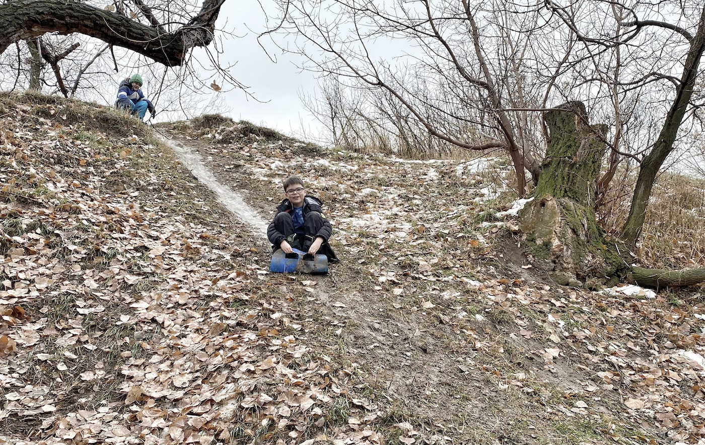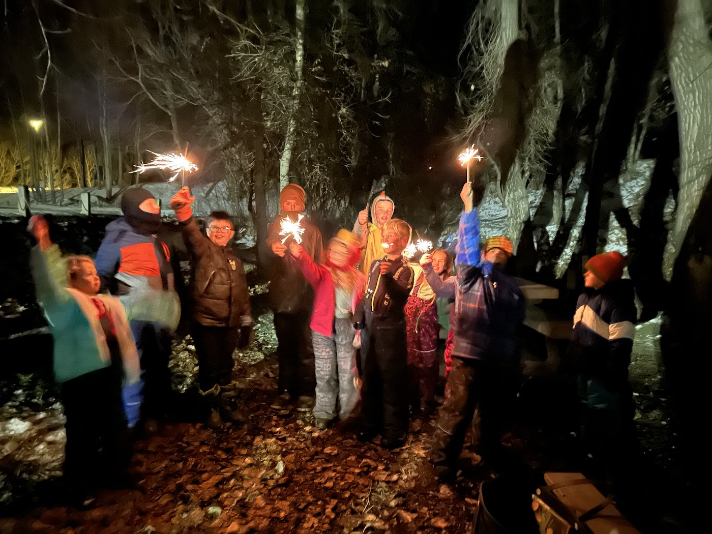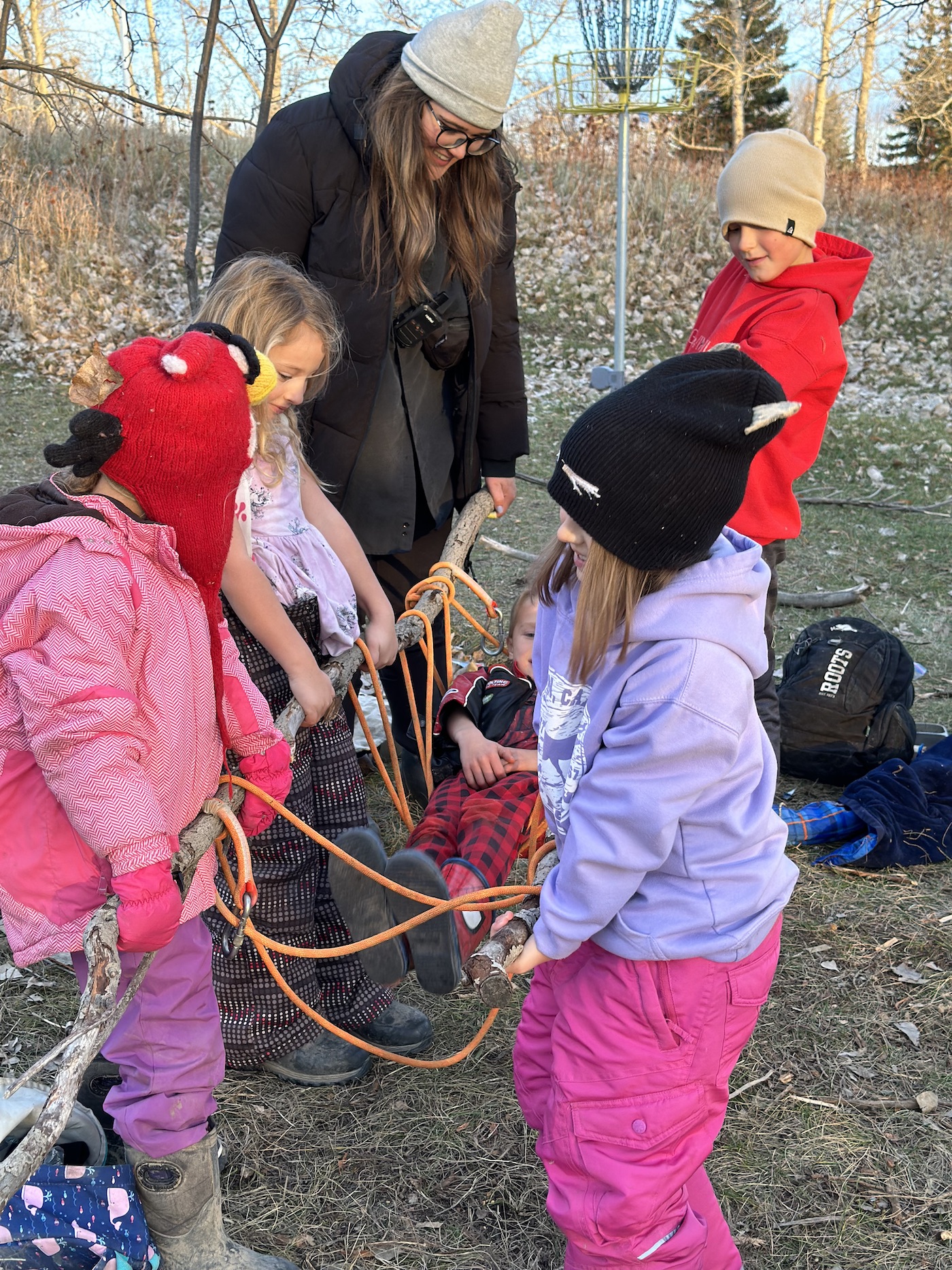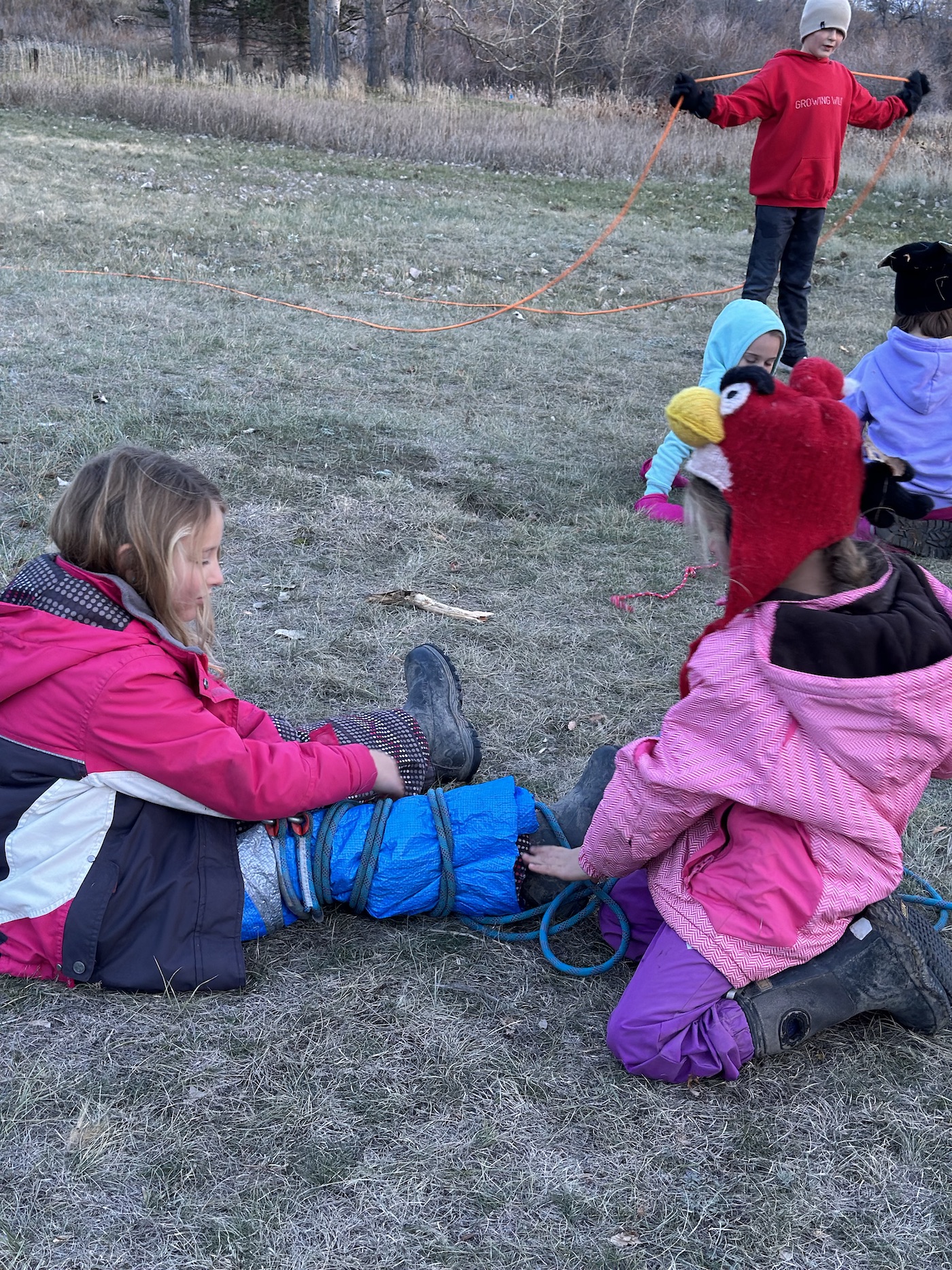 We ended to day listening to a friendly Witch story and laughing as we all tobogganed down the hill in a big train.
