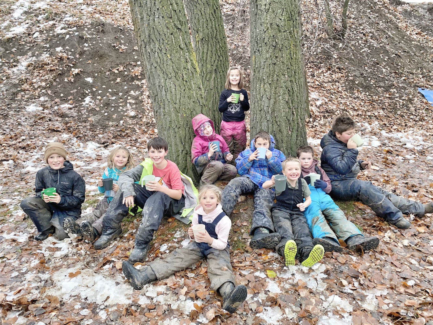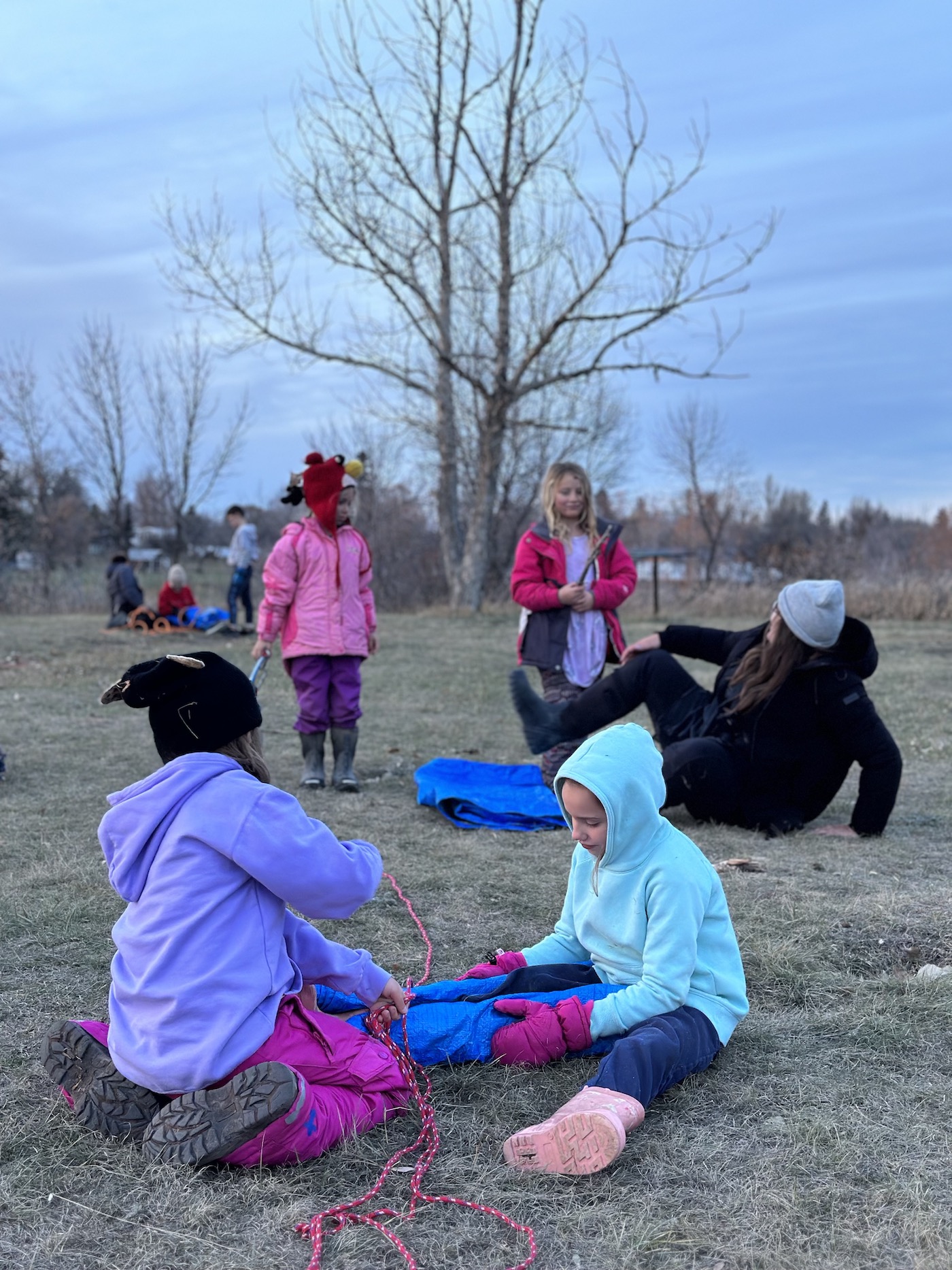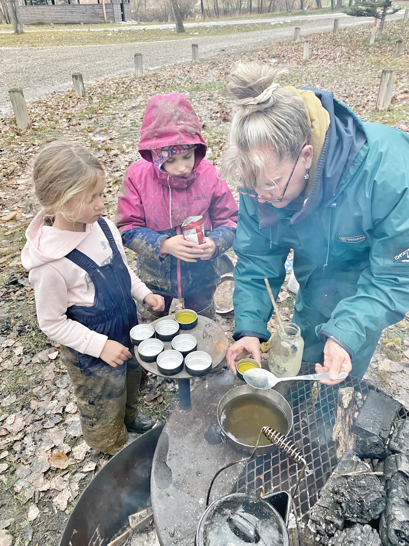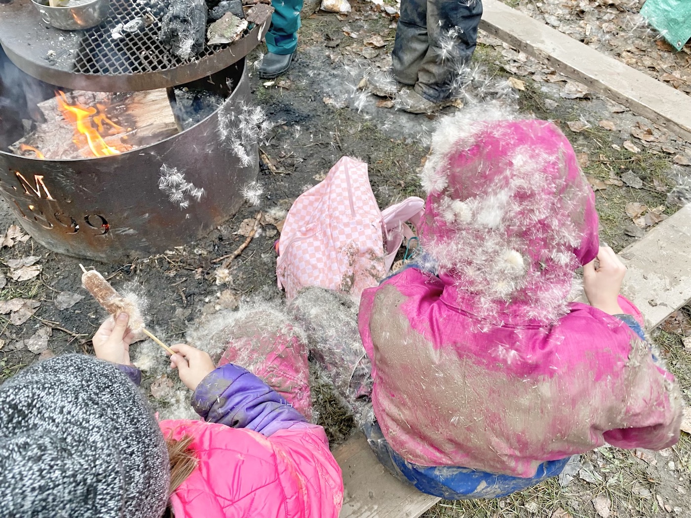 We had herbalist Becky Murry join us today to show us how to make spruce tip salve! We then had hot chocolate, roasted apples and of course marshmallows! These wildlings went right to it continuing their made up game from the previous weeks.